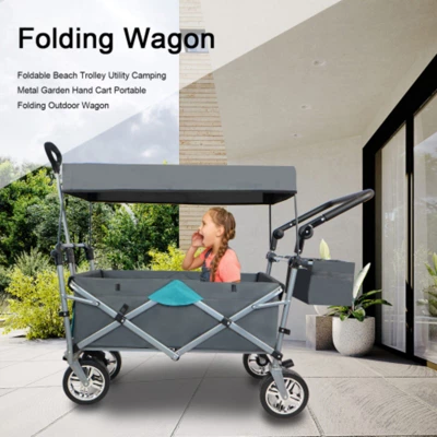 FURNIinspire Outdoor Serving Carts folding collapsible design and durable wheels, this wagon cart glides smoothly over various terrains, from sidewalks to sandy beaches, hassle-free hauling. Made from high-quality materials, including a sturdy steel frame and rugged fabric, this wagon cart is built to withstand heavy loads and frequent use.Our wagon features detachable fabric, which allows effortless removal and cleaning when needed, ensuring it’s always ready for your next adventure.